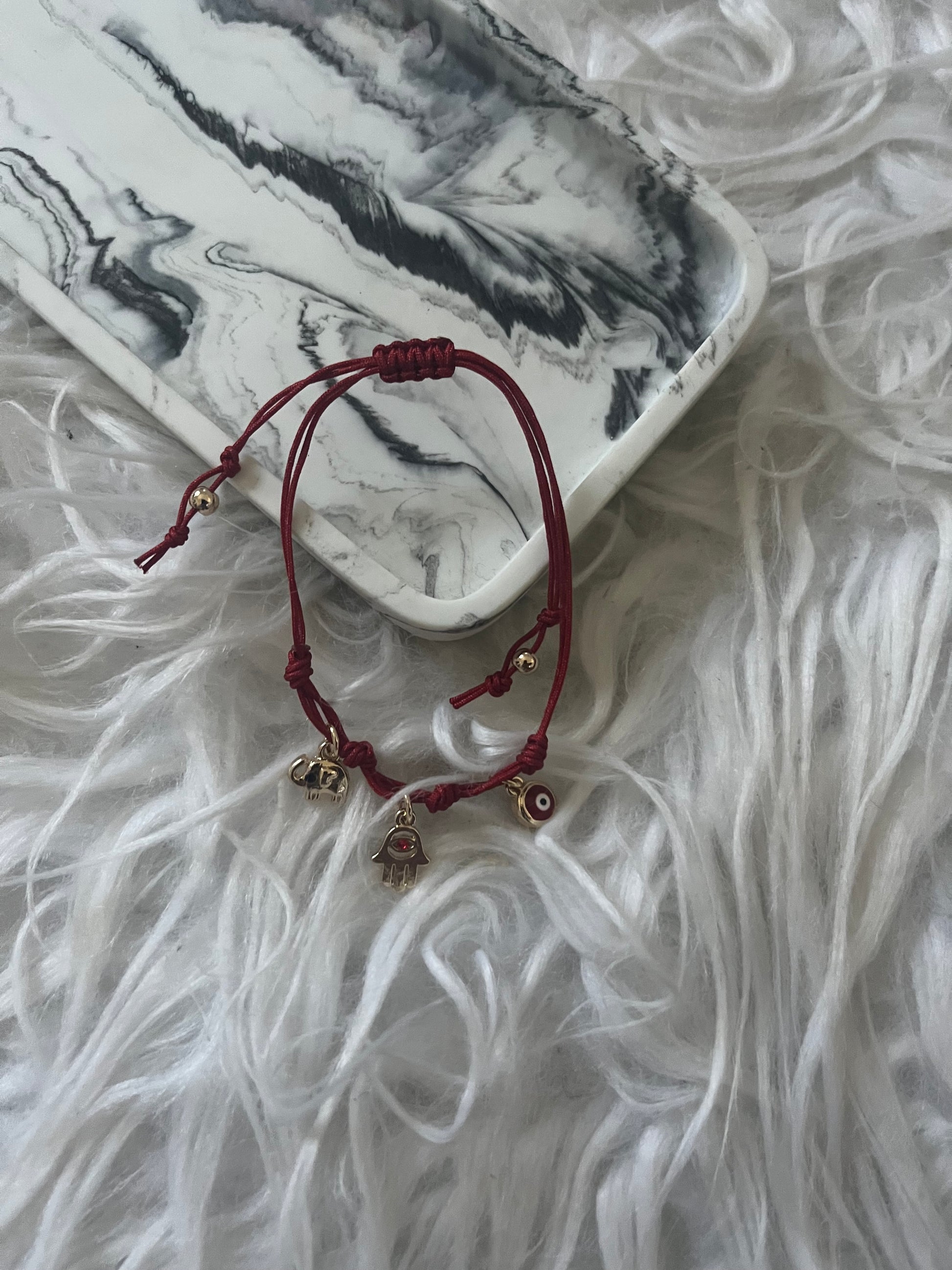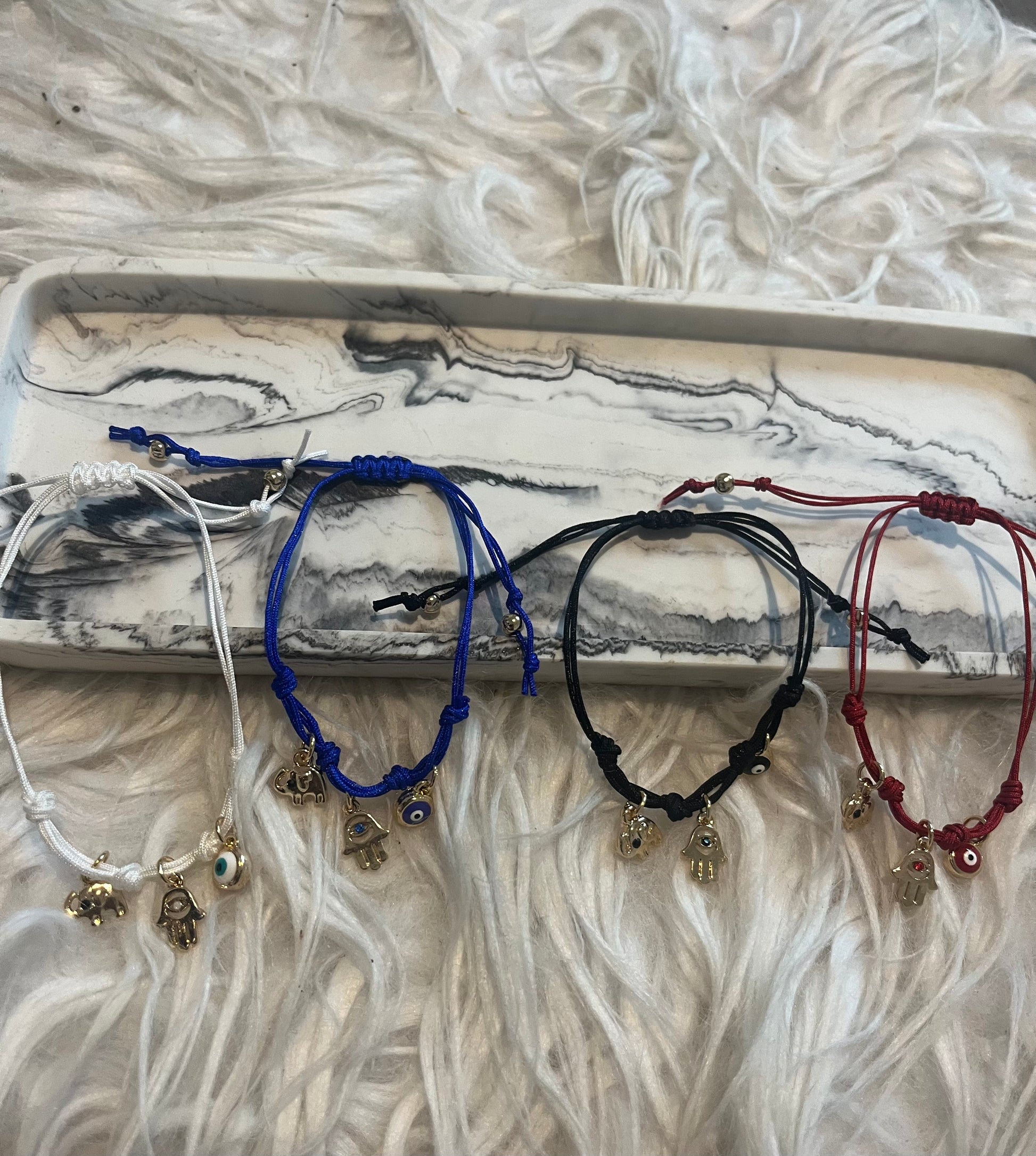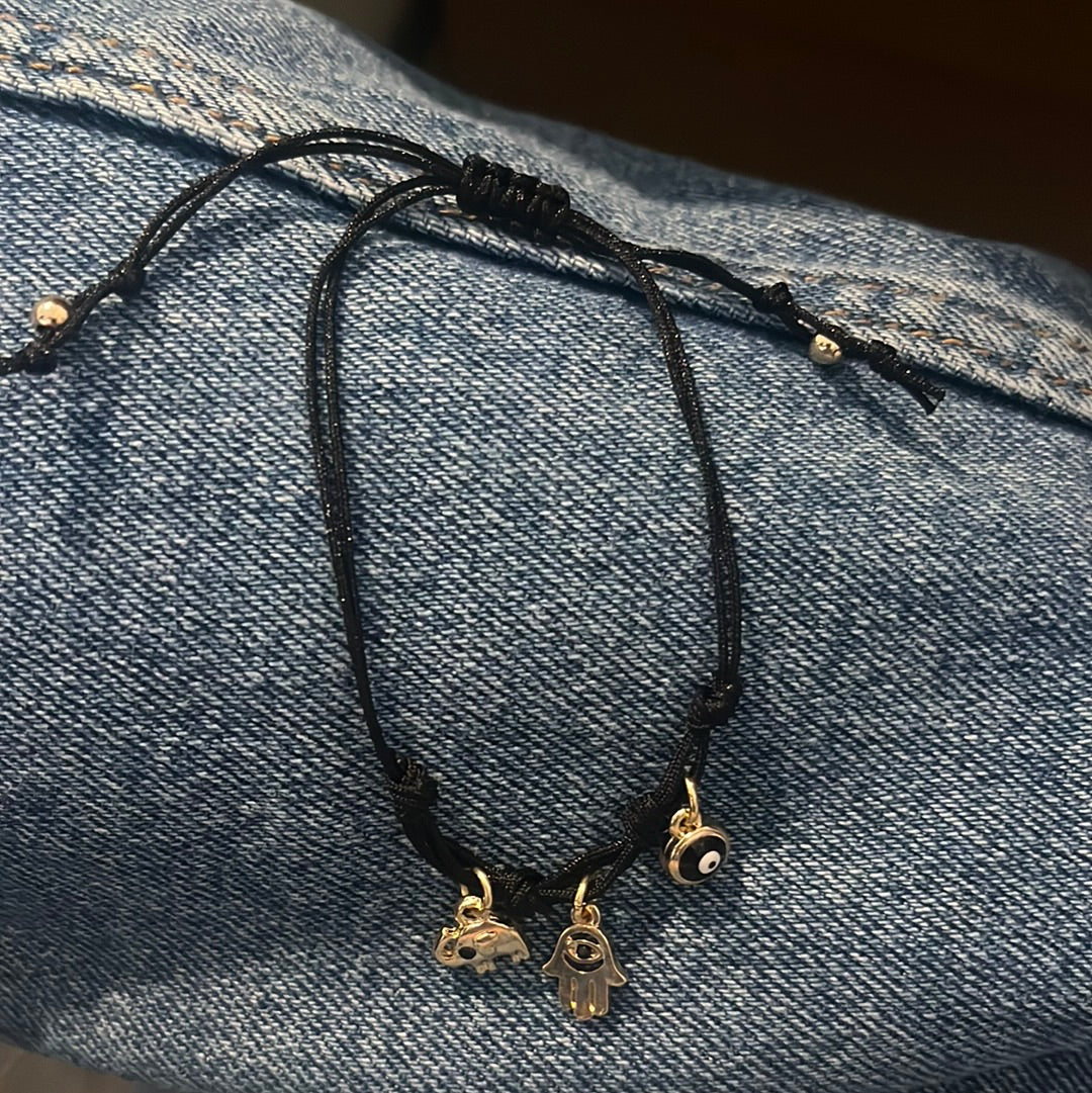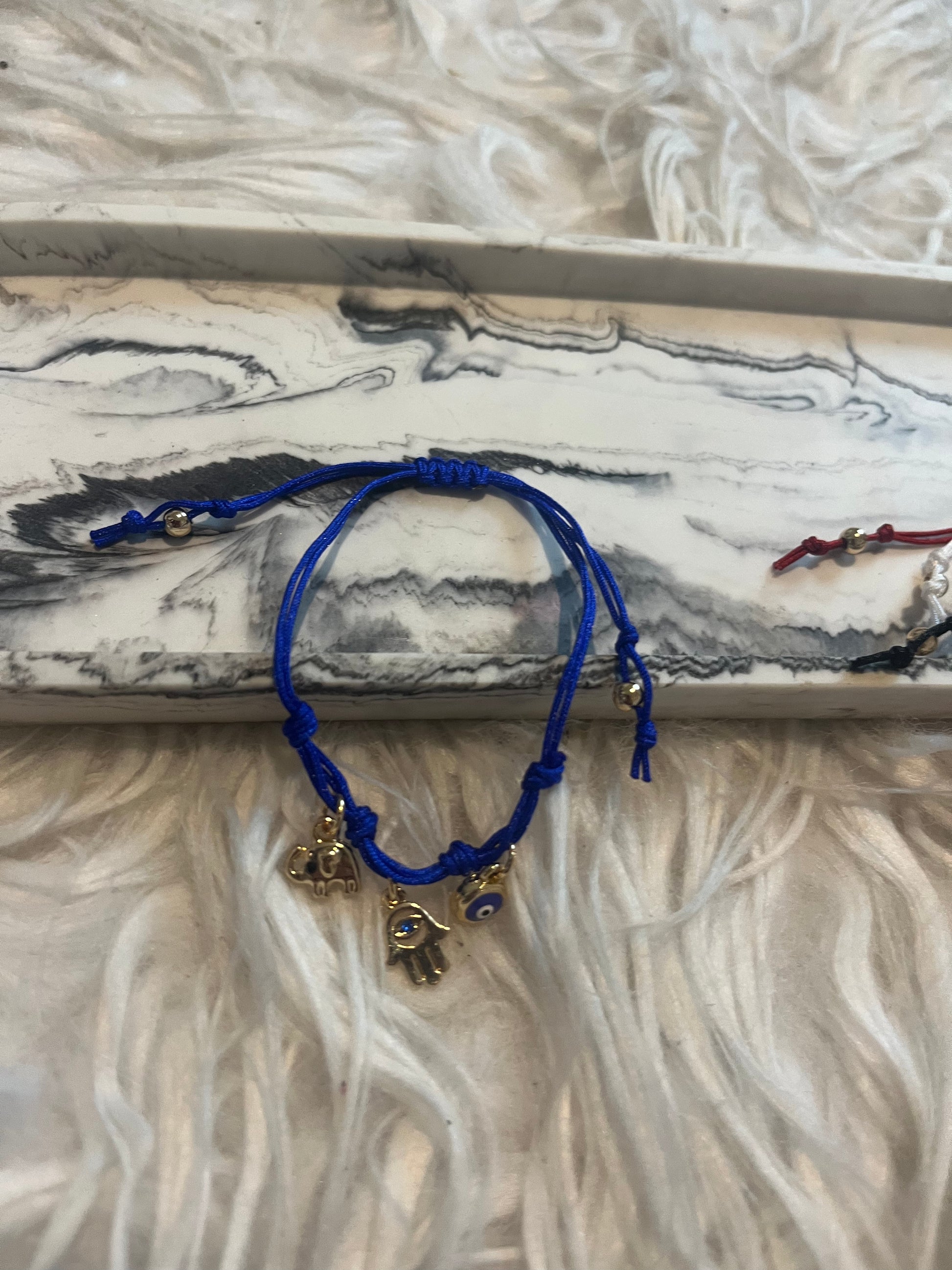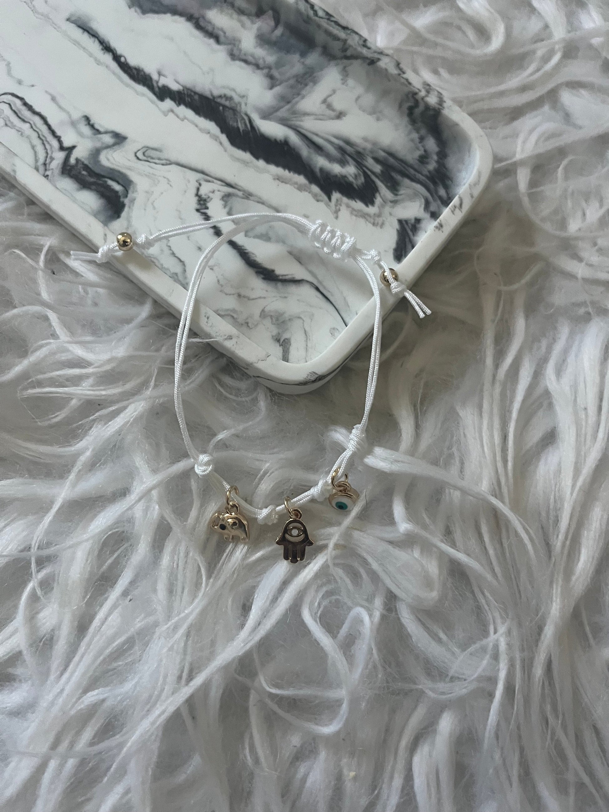 They have a elephant, hamsa hand and evil eye charm .