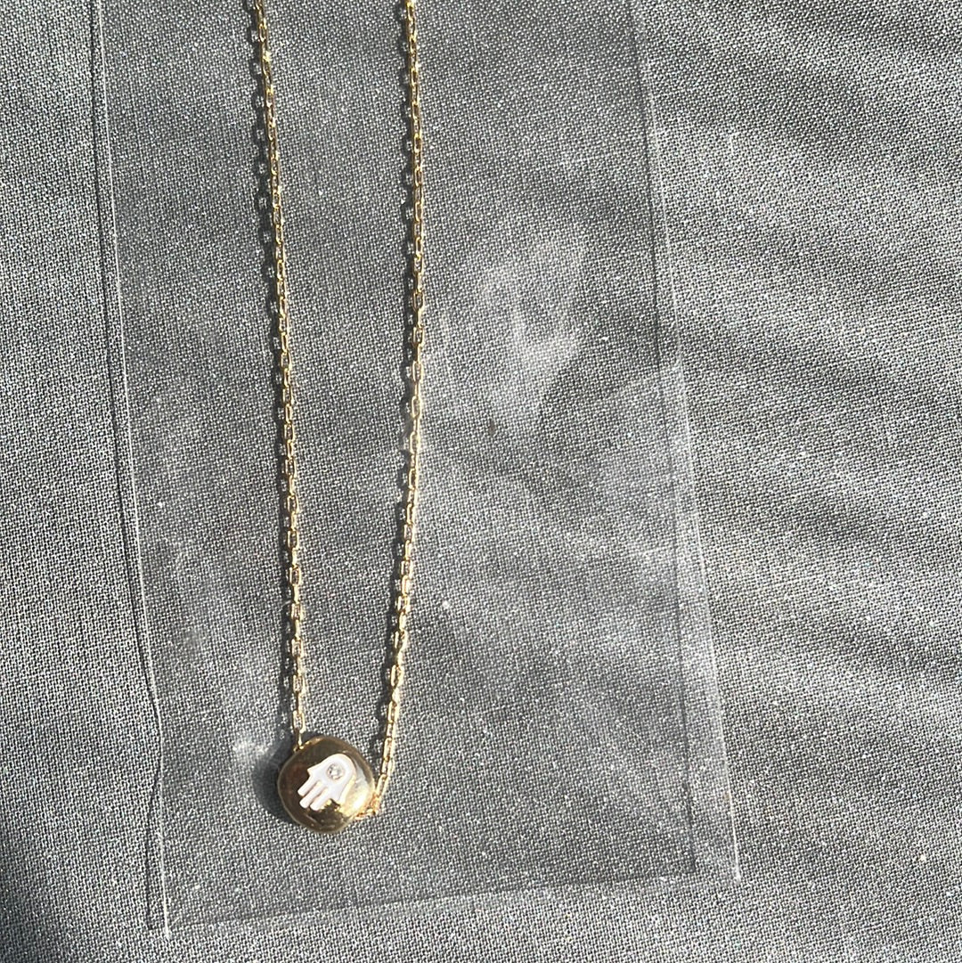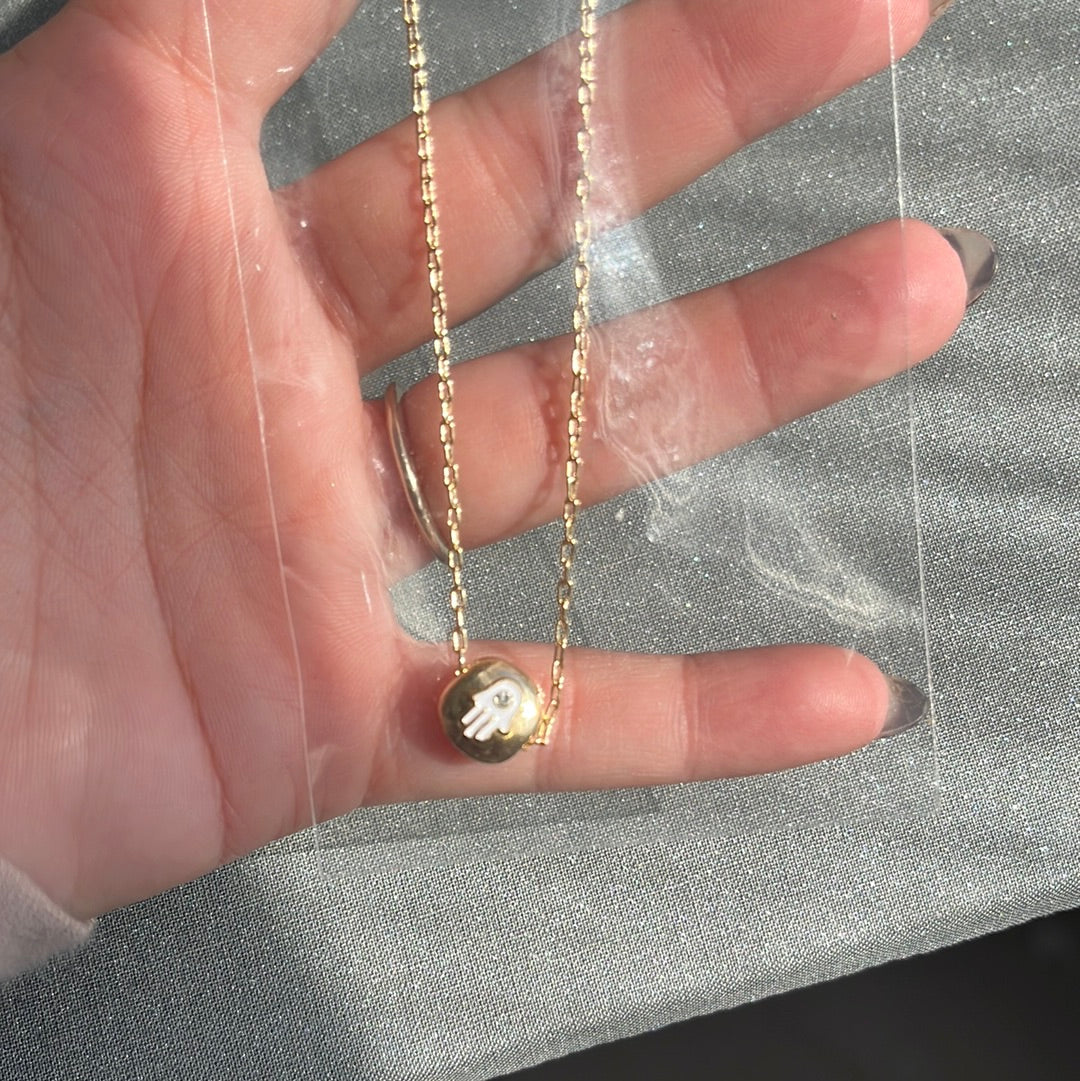 Beautiful Gold Necklace with a Hamsa Hand in White.