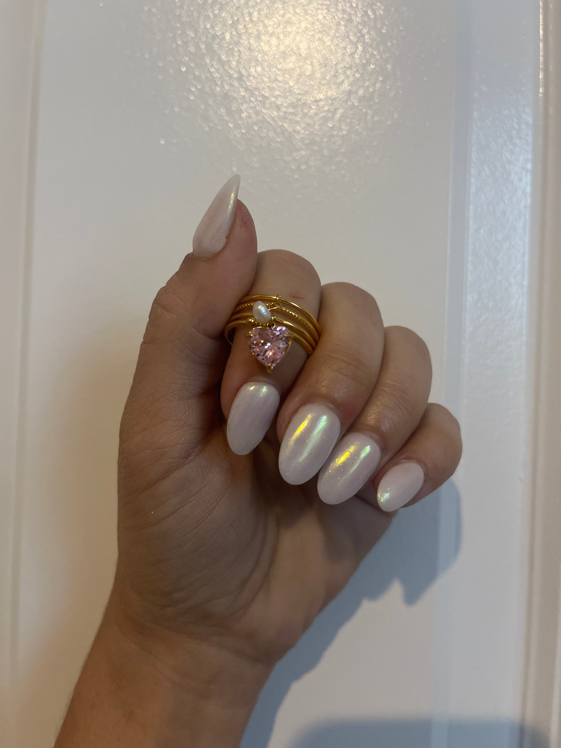Pink heart charm and pearl charm. Open in the back. Stainless Steel.
