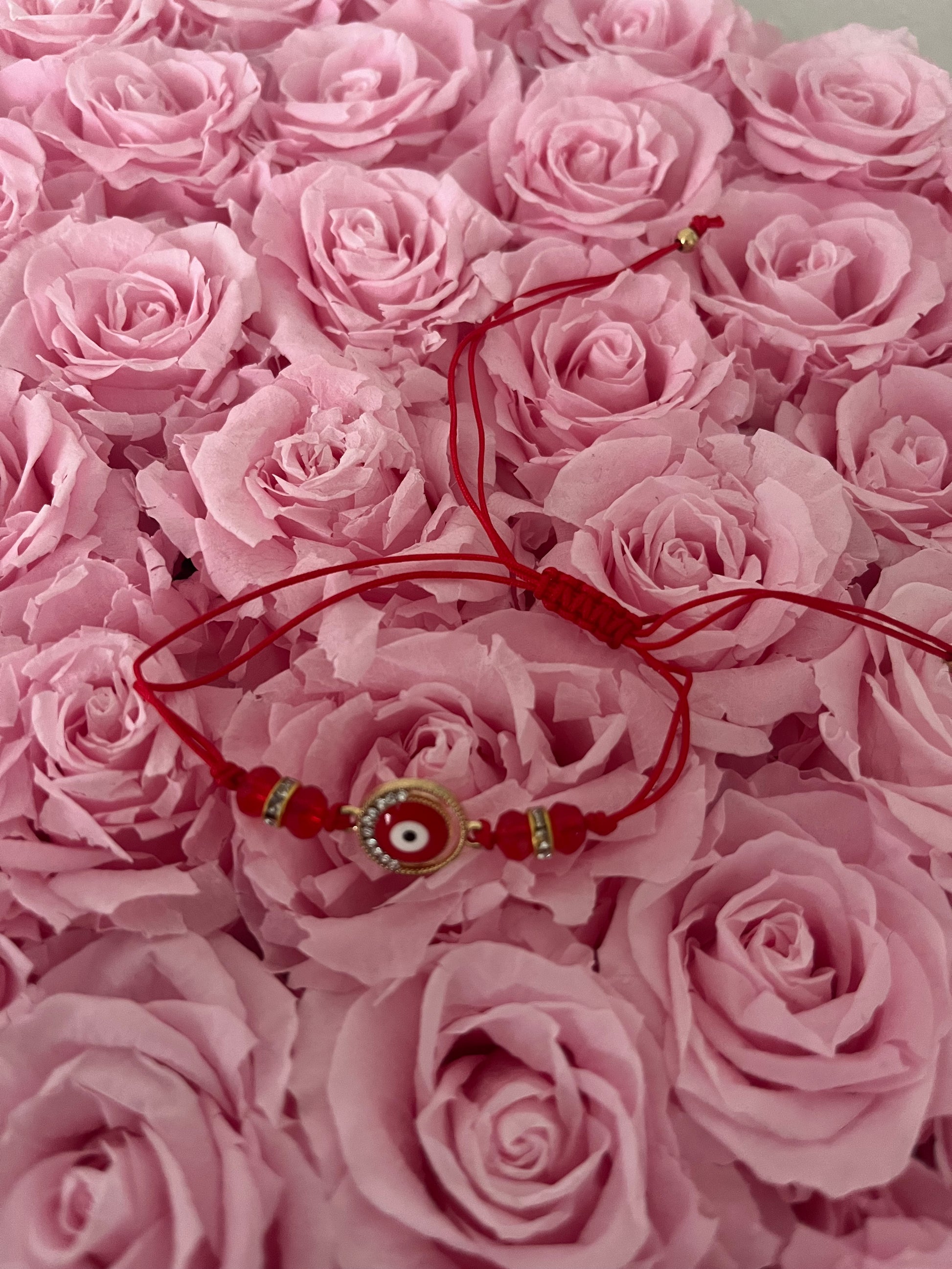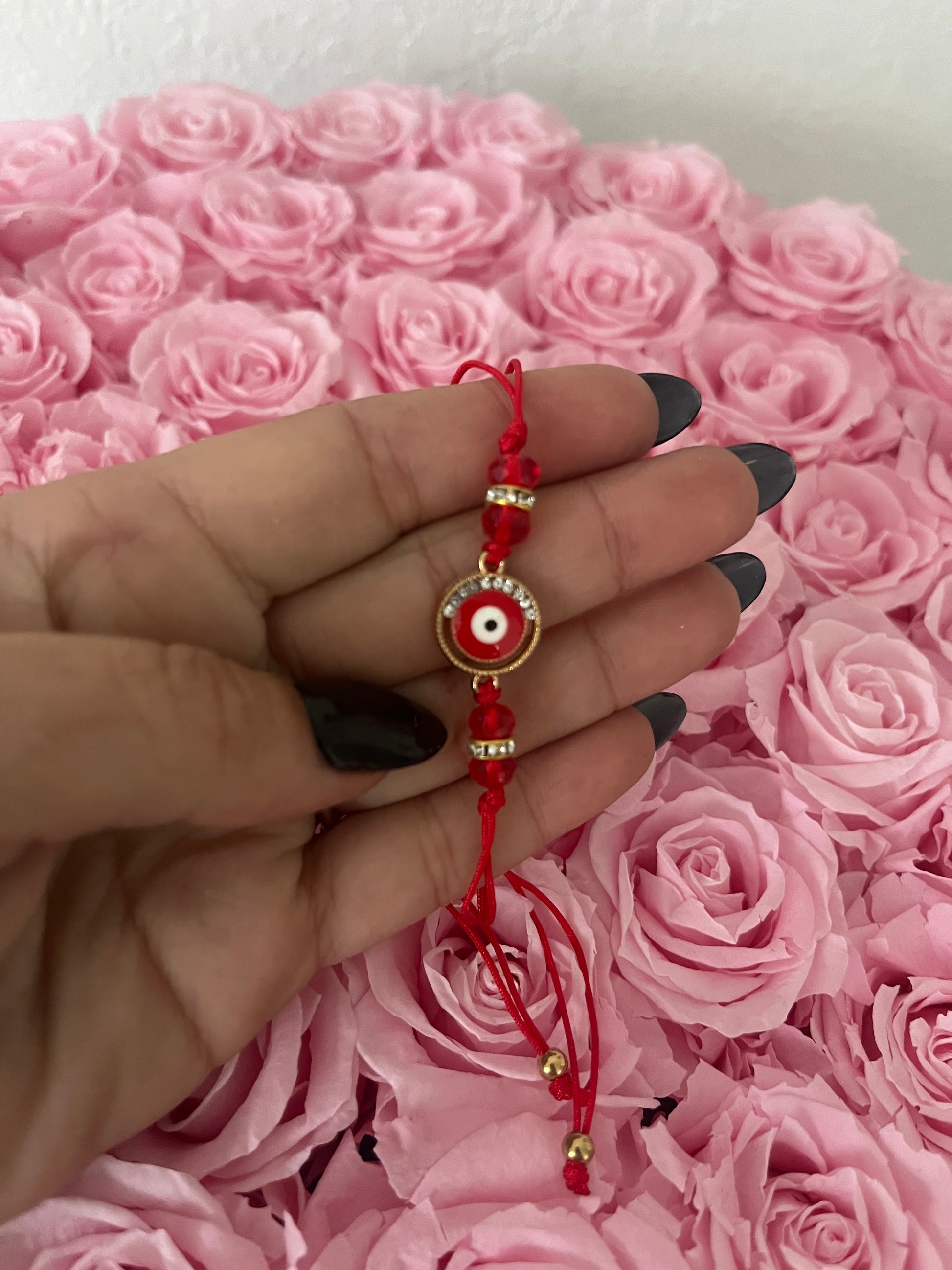 Pull string to fit your wrist, beautiful red and gold evil eye.
