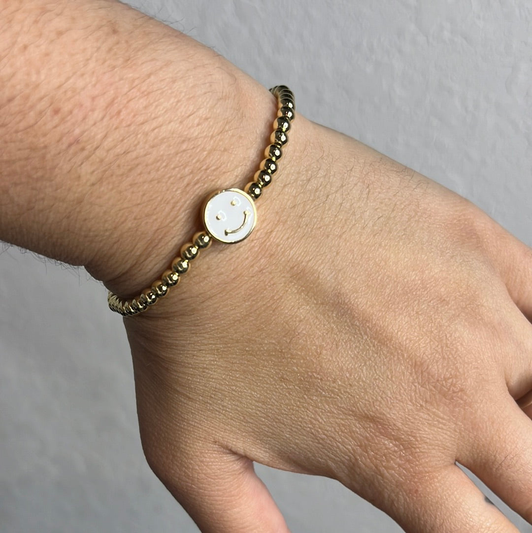 White smiley face on a beaded stretchy bracelet. Super cute and trendy perfect for spring and summer.